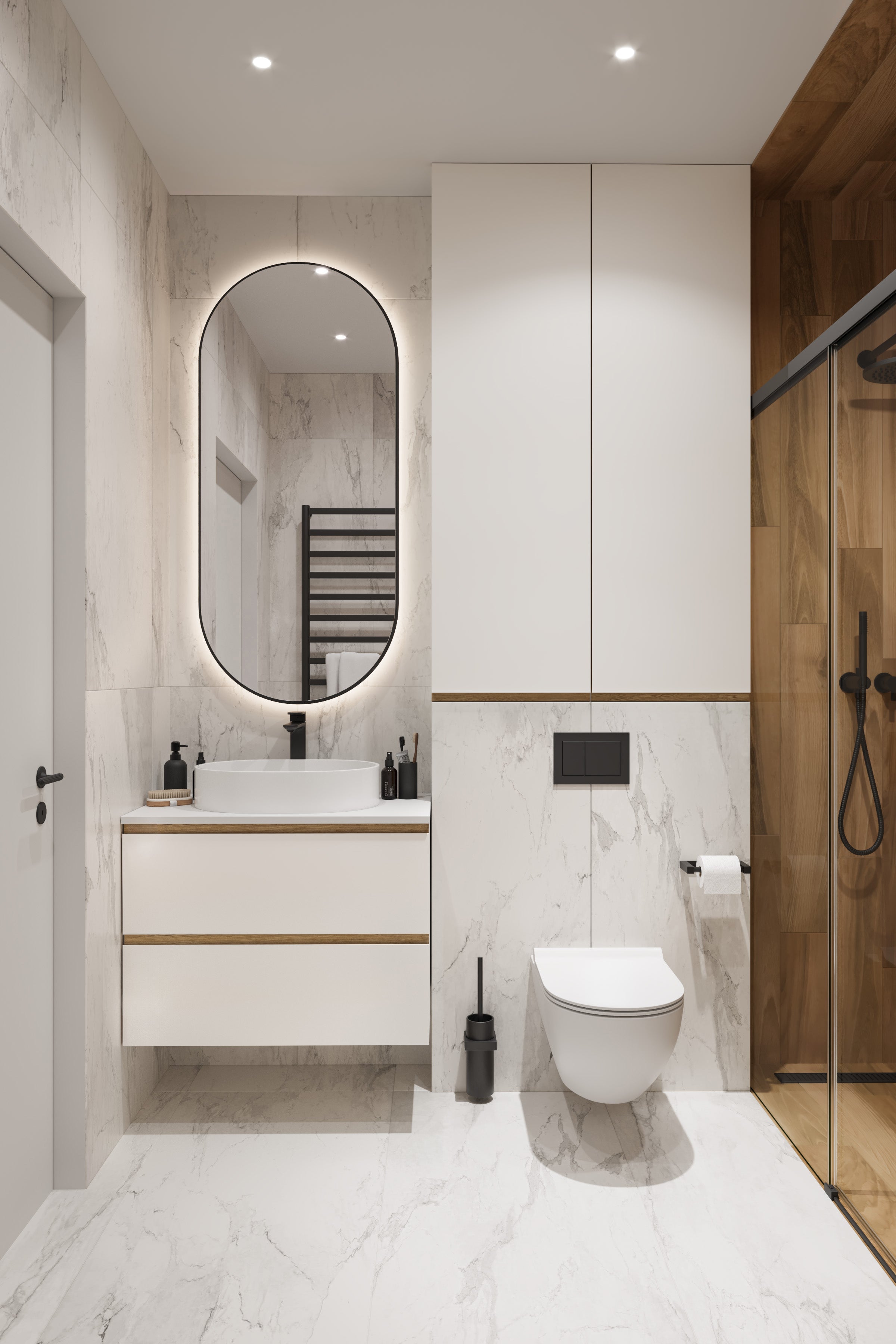 COVE Fenix - BathroomThe durable Fenix NTM finish is applied to both the front and back surfaces, complemented by the integrated handle crafted from white oak. This finishes off the bathroom vanity with a touch of natural warmth and durability.
