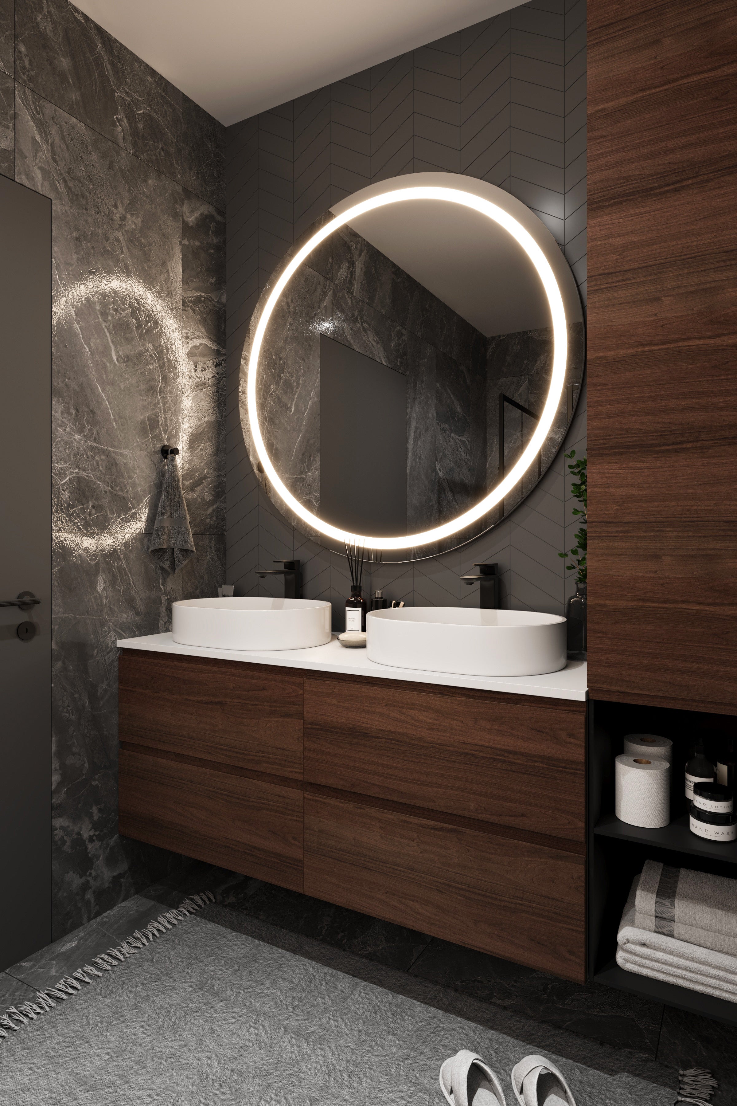 COVE Walnut - BathroomCustom walnut cabinetry for your bathroom vanity, featuring fronts with thick solid wood applied to all four edges and finished with premium walnut veneer on both the front and back.