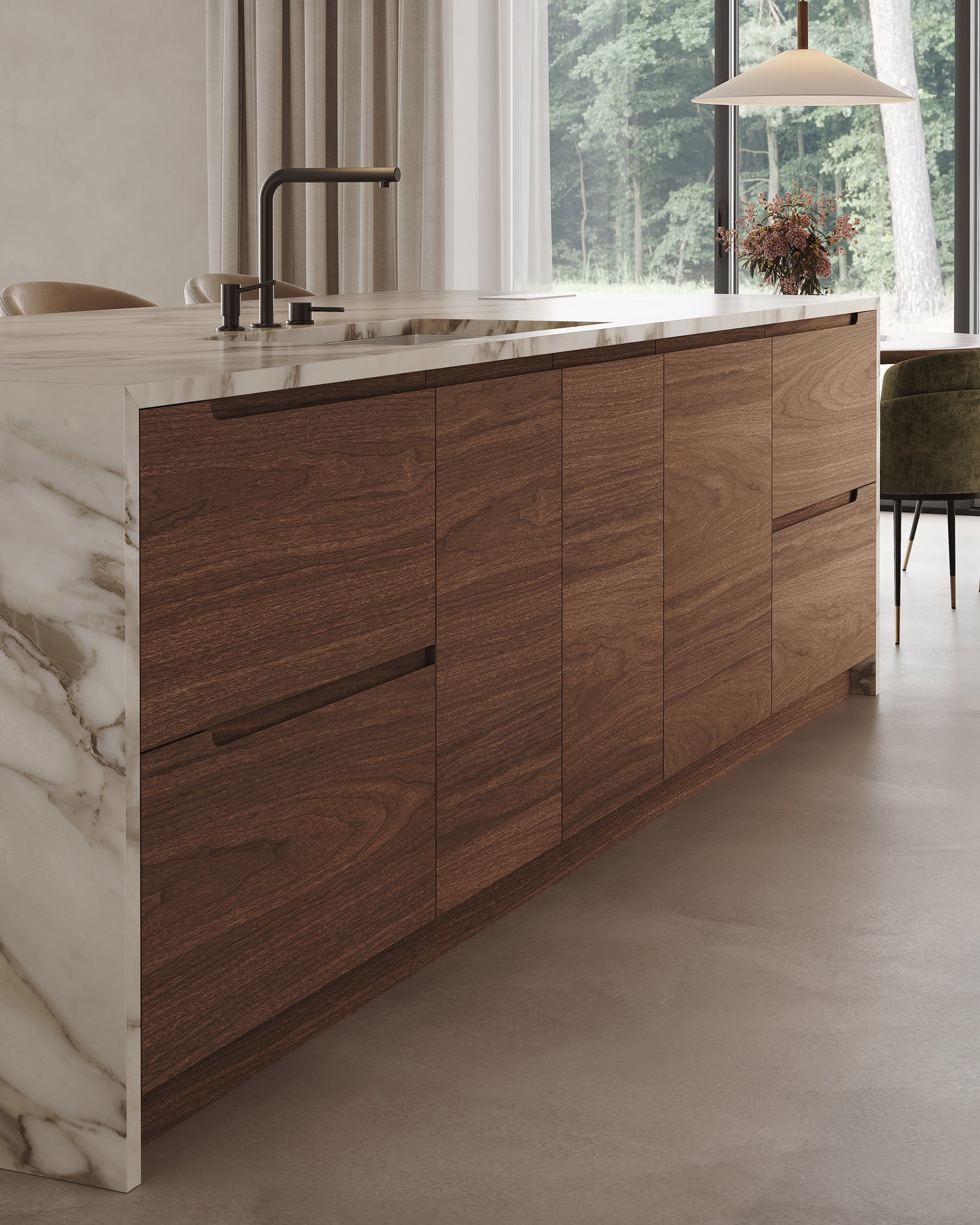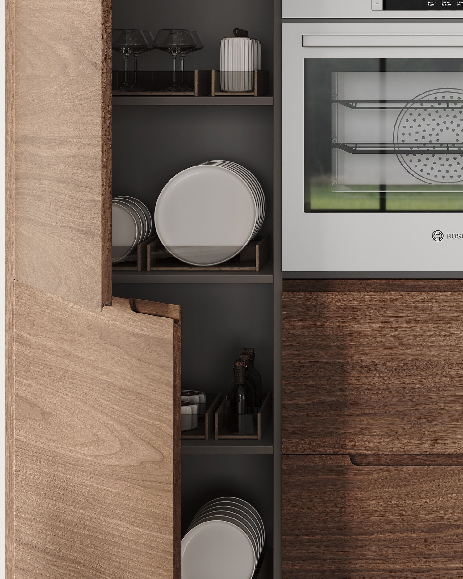 Chosen for its long-term performance, black walnut ages beautifully over time, developing deeper tones and character. Its natural beauty and durability make it an exceptional material for modern kitchen cabinets designed to last for decades.