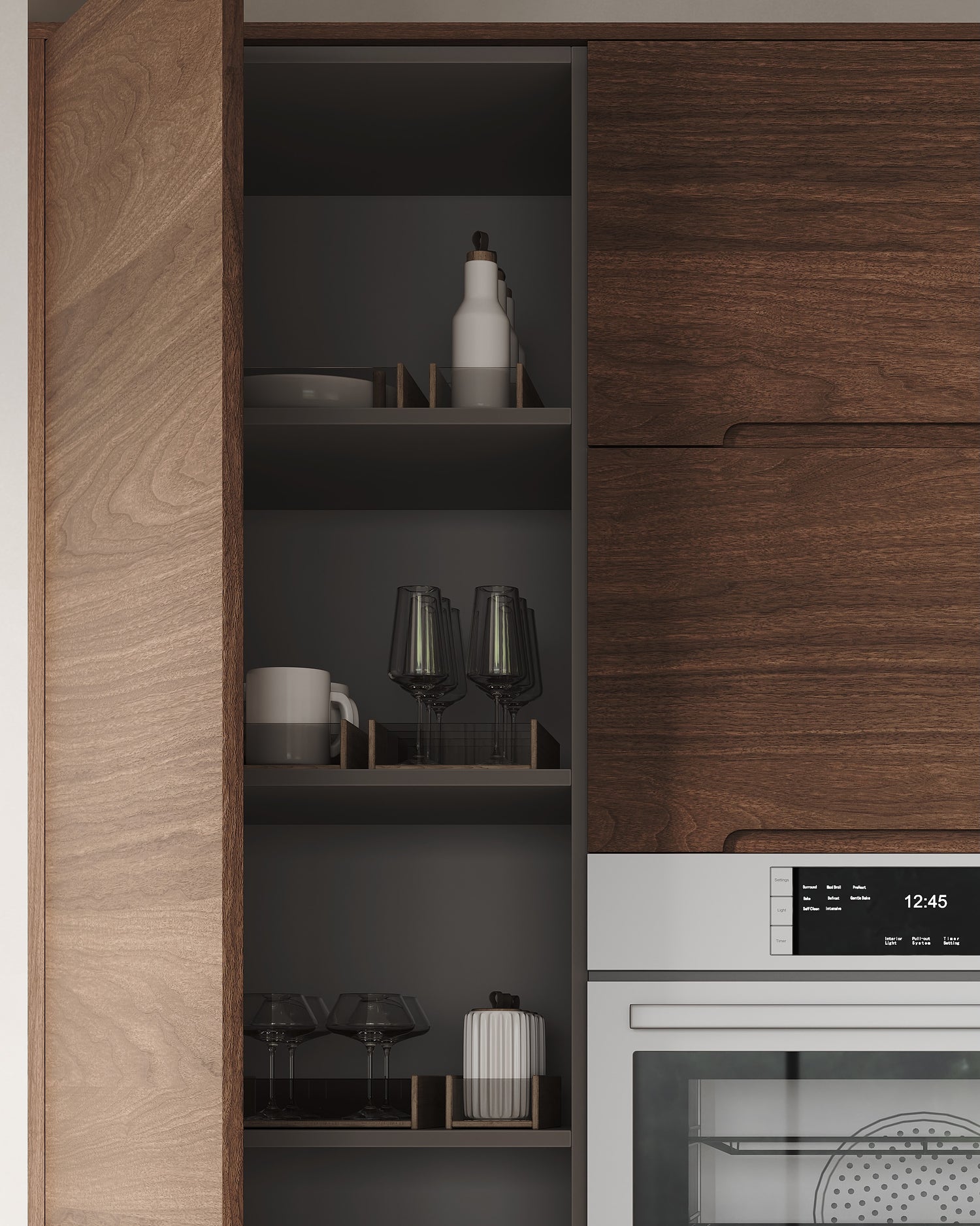 The ARC Collection pairs seamlessly with our fully custom cabinet boxes, finished in a refined matte grey interior that complements both wood and painted door finishes.