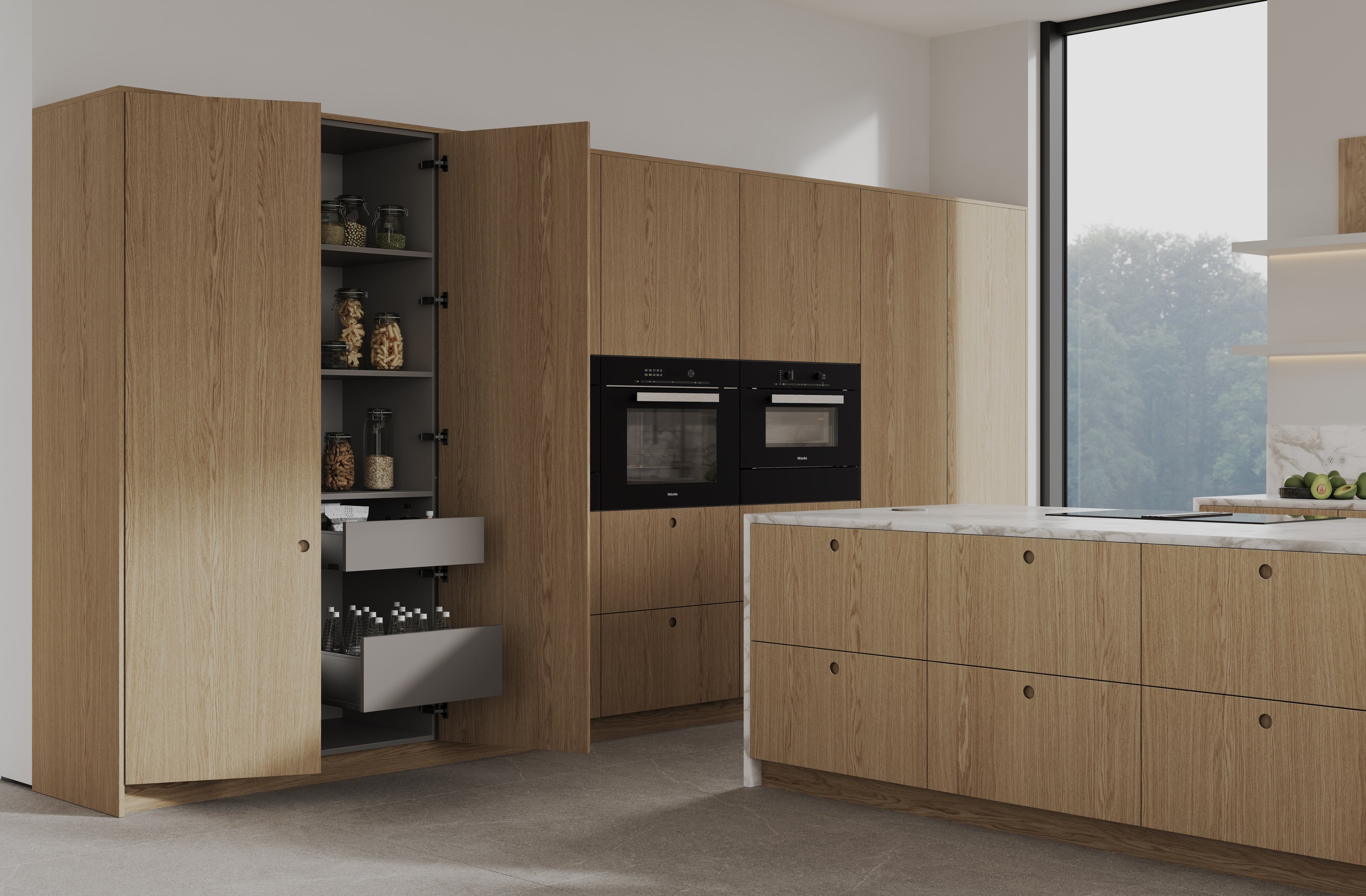 For an even more cohesive and elevated appearance, we offer vertical grain continuation across doors. This technique creates a smooth, uninterrupted flow of wood grain, enhancing the architectural clarity and elegance of white oak kitchen cabinets.
