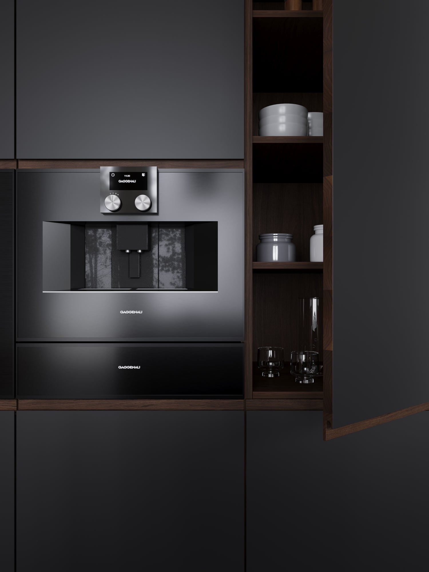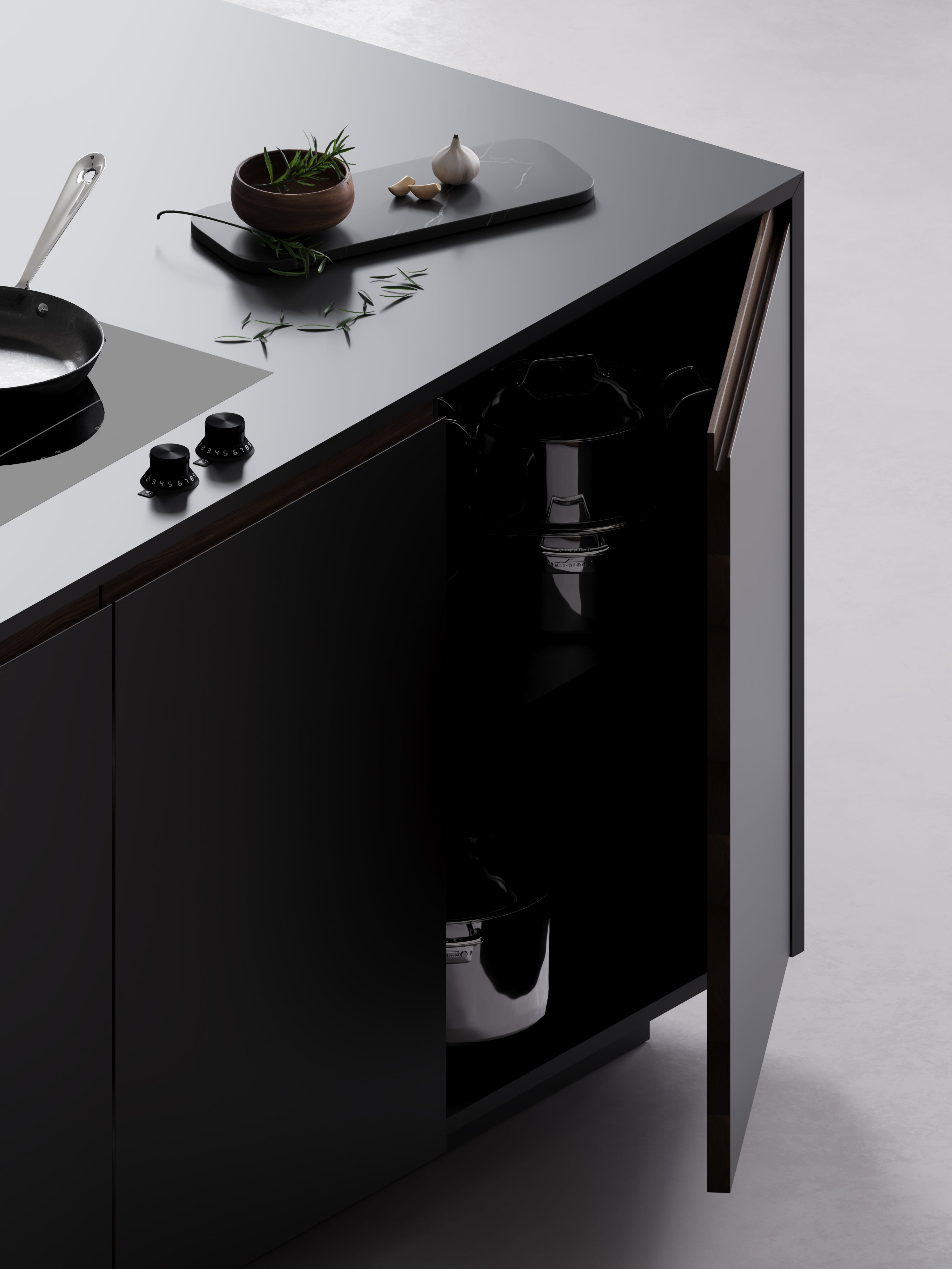 Fenix material graces both the front and back surfaces of the panel, ensuring a stylish appearance whether your cabinets are open or closed. By blending various Fenix colors with black walnut wood, this design effortlessly combines style and warmth, infusing your kitchen space with a unique aesthetic.