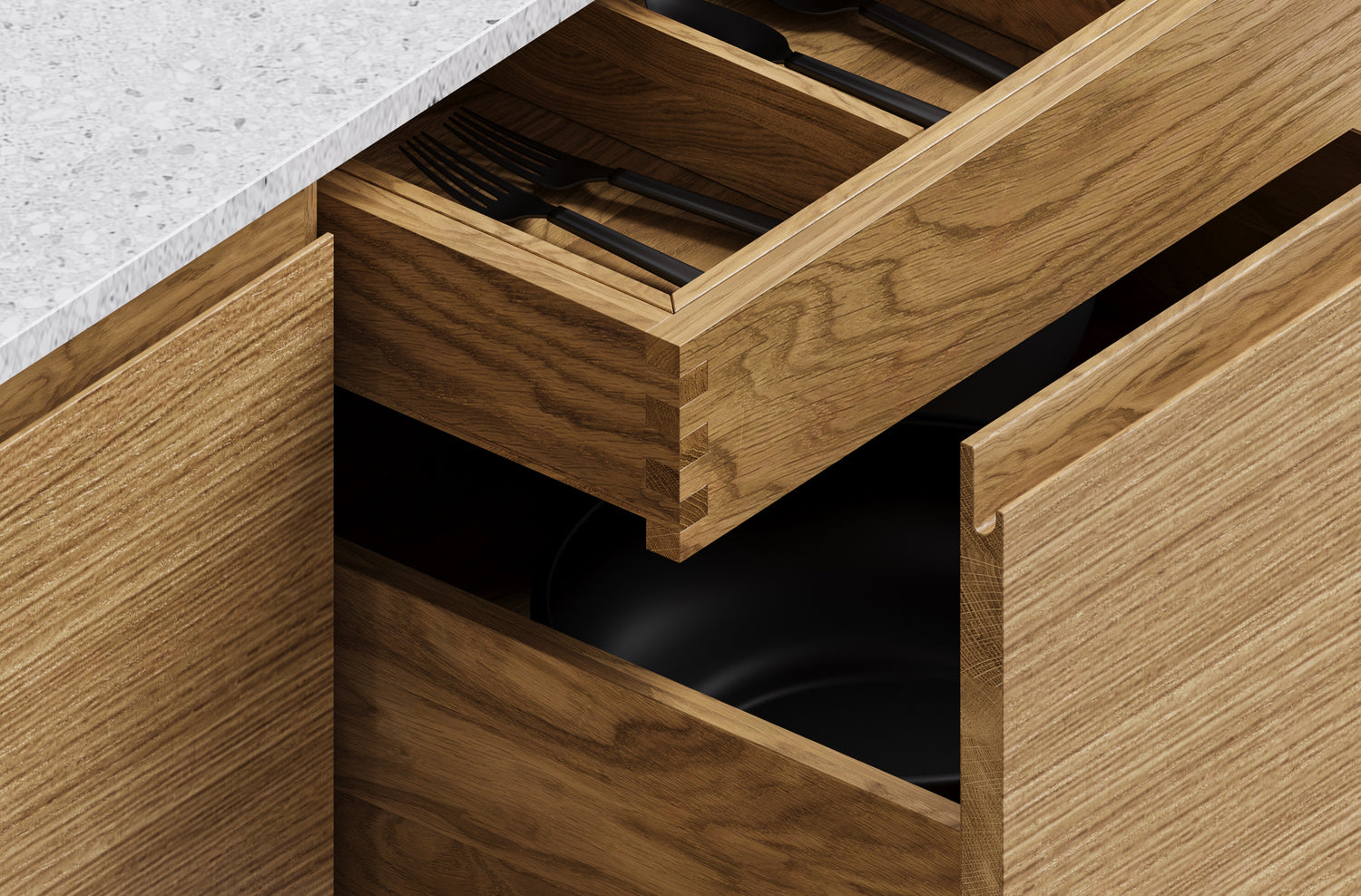 Our fronts are crafted from top-tier white oak veneer. We handpick the finest wood patterns to adorn the front and side sections of each panel. The handle is fashioned from solid white oak, ensuring durability and imparting a robust feel.