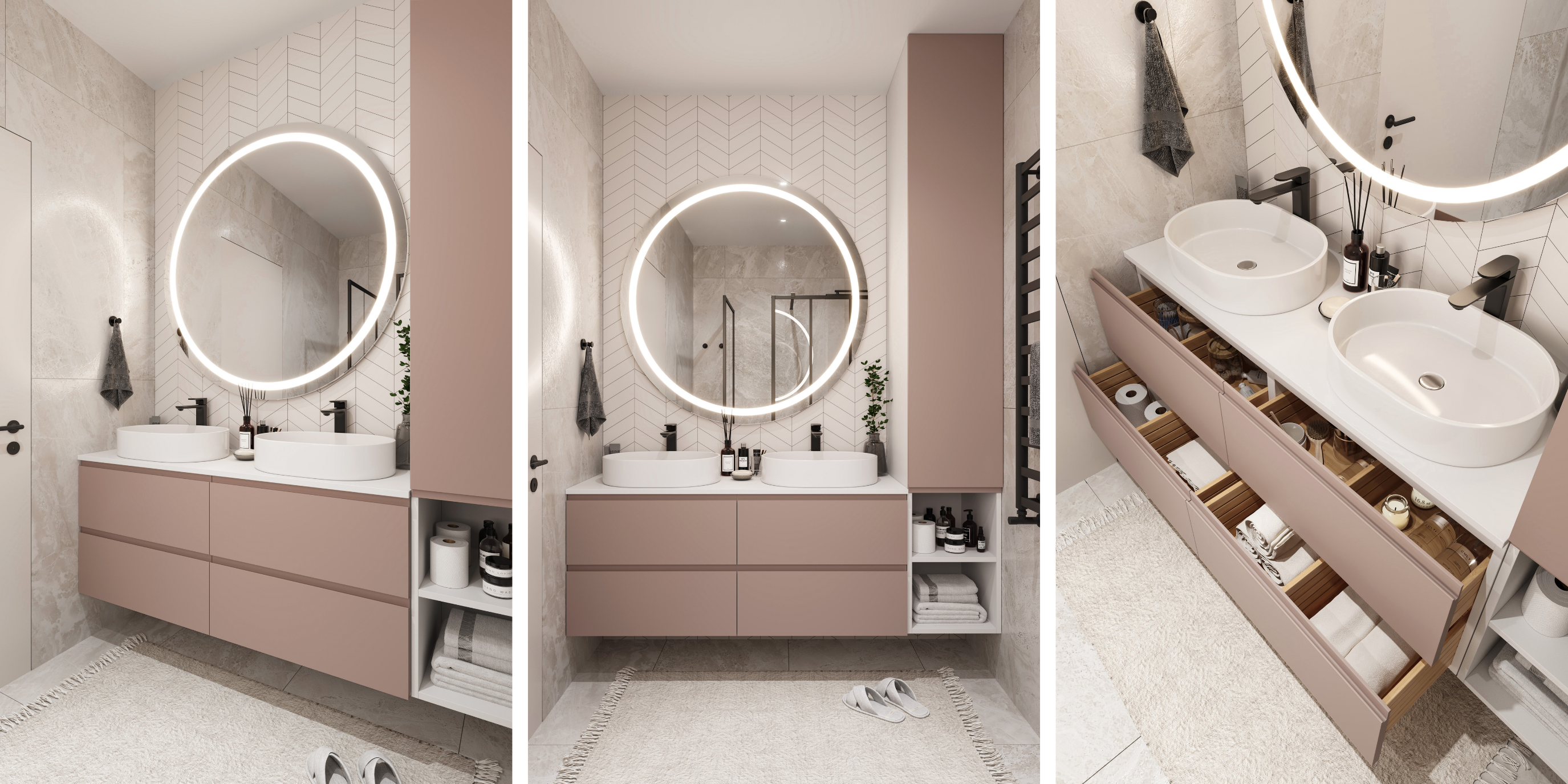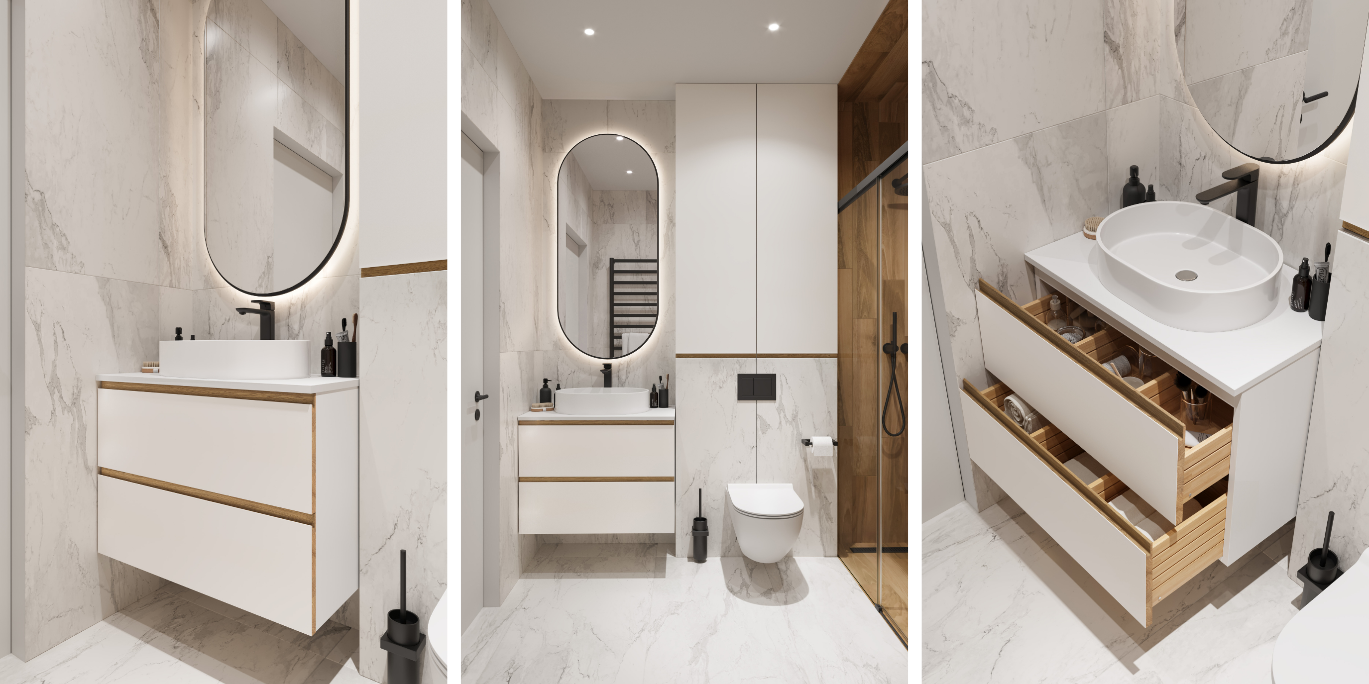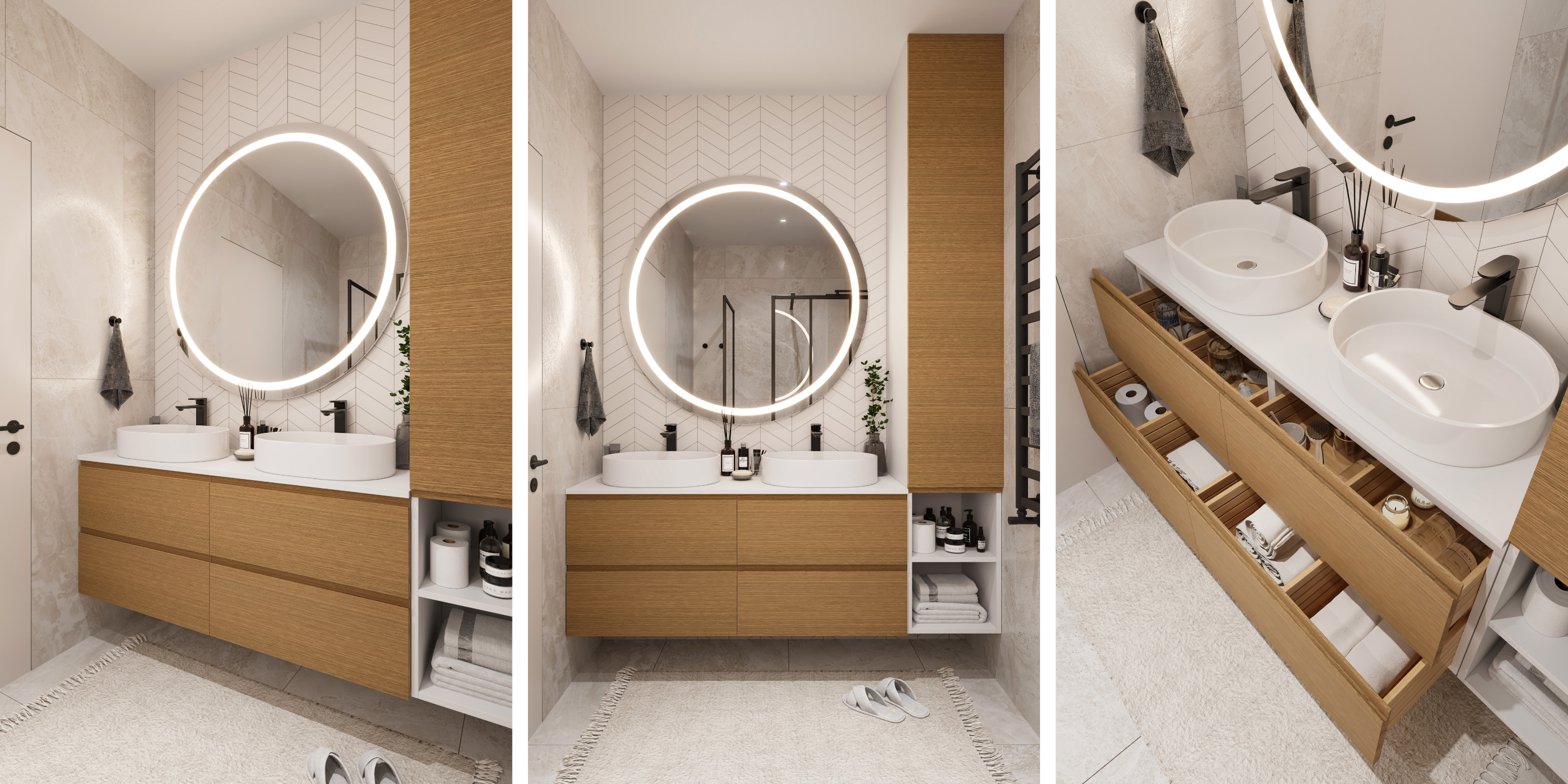 Introducing our timeless integrated handle design for your vanity units. Crafted from premium materials such as white oak, black walnut, or Fenix NTM, we also offer painted versions of the doors. They are compatible with both the current Godmorgon version and the previous generation.